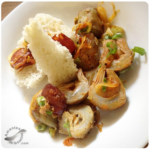 ●Cuando la alcachofa esté lista, la añades al chorizo, mezclas y decoras con cebollín fresco cortadito.